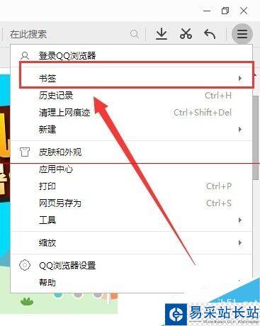 2.打開功能按鈕,可以看到登錄、書簽、歷史記錄、清理上網痕跡等,我們選擇書簽選項進入到下一分頁面。