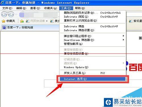 2、點擊之后,會彈出一個下拉菜單。其中,最下面一個選項叫做Internet選項,這個就是我們需要的內容,我們點擊進入。