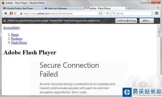 安全研究人員已經在Adobe Flash最新版本發現了一直沒有被Adobe修補的安全漏洞,而這樣的安全漏洞影響全球范圍。特別地,幾款漏洞利用工具包已經在利用這樣的安全漏洞把加密勒索軟件用到運行Adobe Flash的系統。為了保護Firefox在互聯網上不受到損害,Mozilla已經將Adobe Flash最新版本及其所有之前的版本加入到該瀏覽器的禁止運行列表,致使Adobe Flash在Firefox受阻,要么設定其“要求激活”。