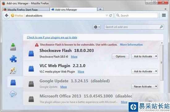 Adobe Flash所存在的安全漏洞讓其所有版本在Windows、Linux和Macintosh系統上運行時都受到影響。Firefox在其插件管理頁面發布了一個有關Flash存在安全漏洞的警告信息(如下圖),Shockwave Flash被設置成“要求激活”和“永久允許”狀態選擇。
