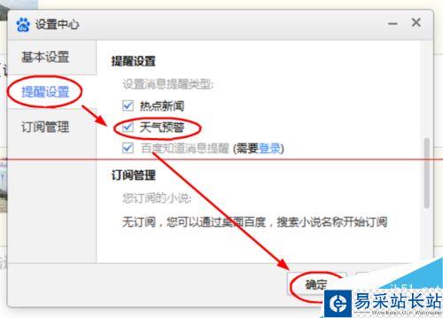 3、在【設置中心】界面下,點擊選擇【提醒設置】--勾選【天氣預警】--【確定】選項完成設置。(如圖所示)