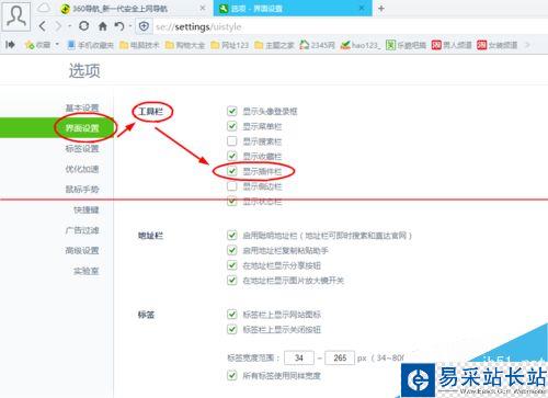3、在【選項】界面下,點擊 選擇【界面設置】--【工具欄】--勾選【顯示插件欄】選項完成設置。(如圖所示)