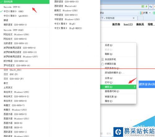3、在百度主頁位置右鍵后,我們點擊選擇右鍵彈出選項中的“編碼”,并從編碼選項中找到并點擊“自動檢測”選項,然后再重新打開百度,如此,就解決了百度亂碼的故障了。