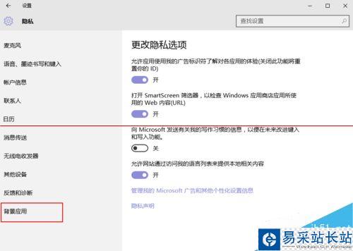 2、在打開的“隱私”設置選項欄中,拖動滾動條,找到最后的“背景應用”,如圖所示。