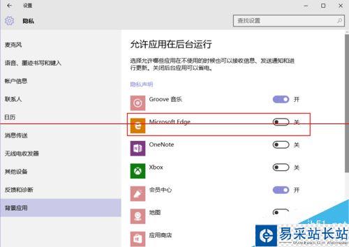 3、打開“背景應用”設置。在右邊欄找到“Microsoft Edge”,將開關設置為“關”。如圖所示。