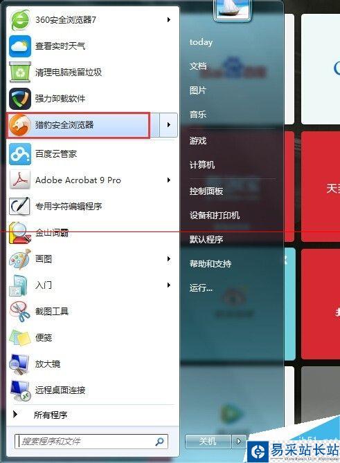 1、打開。先要找到并點擊打開獵豹瀏覽器,每個人圖標放置的位置不同,這里是從開始菜單里找到并打開的。