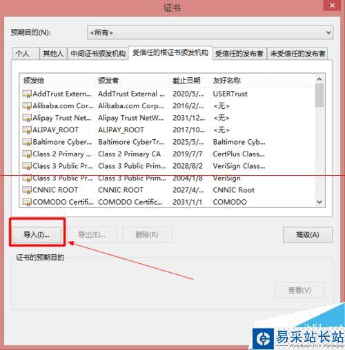 3、然后我們可以點擊“管理證書”按鈕,在彈窗中選中第4項“受信任的根證書頒發機構”,點擊“導入”按鈕