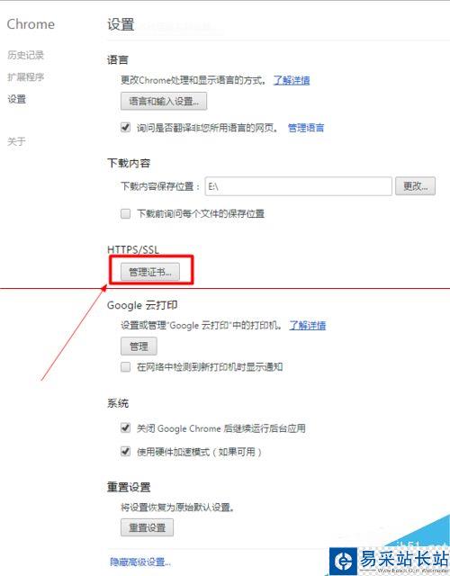 1、進入瀏覽器的設置界面,找到“管理證書”按鈕