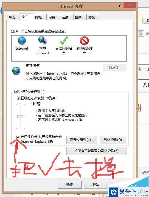 2、點擊“安全”把啟用保護模式前面方框內的對勾去掉,點擊確定!