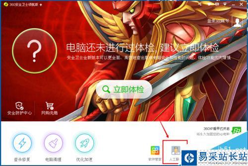 2、在360安全衛士的右下角找到【人工服務】,然后用單擊鼠標左鍵打開“人工服務”選項。如圖所示;