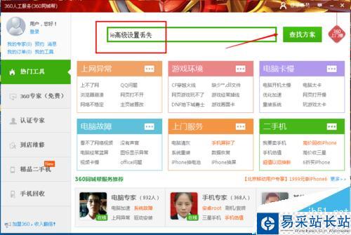 3、在“人工服務”窗口的搜索框輸入我們的問題【ie高級設置丟失】,然后點擊“查找方案”。如圖所示;