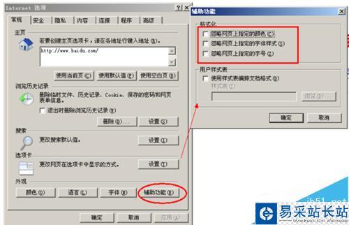1、打開internet選項之后,找到常規(guī)--- 輔助功能里面格式化,把勾都選上。點擊確定