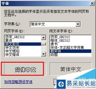 3、出現(xiàn)的字體對話框中,IE瀏覽器默認的字體格式是宋體和新宋體(網(wǎng)頁字體HTML和純文本)