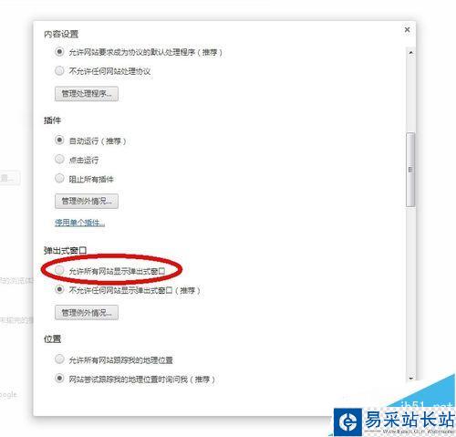 5、在“彈出式窗口”部分,選擇“允許所有網站顯示彈出式窗口”。