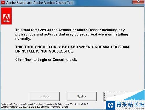 1、有那個錯誤提示是因為系統有殘余的Adobe Reader XI的安裝文件,如果把這些文件都刪除也是能解決的,但是Adobe Reader XI 的文件在系統中的哪個地方呢?怎么找這個工作量比較大,Adobe公司也考慮了這個問題所以推了AdbeArCleaner卸載工具,運行該工具點擊【NEXT】