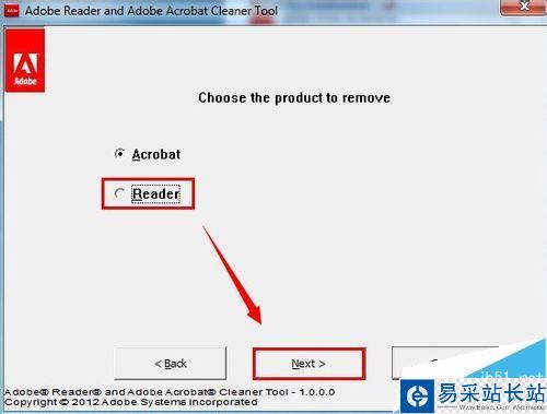 3、因為是Reader安裝所以選擇【Reader】再點擊【NEXT】,此時會自檢測系統的Adobe Reader XI 然后刪除,在提示完成的時候重啟一下電腦再次運行Adobe Reader XI 安裝文件就可以了。