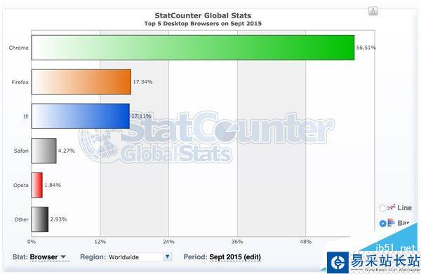 另一份來自StatCounter的統計數據則顯示:Chrome瀏覽器名列第一,市場份額56.51%,與8月份數據持平。Firefox火狐瀏覽器在9月份開始,以17.34%的市場份額躍居第二位,也算是史無前例。IE瀏覽器市場份額17.11%,8月份同期數據為17.51%,雖然市場份額下降不大,但排名卻跌至第三名。Safari瀏覽器市場份額為4.27%,7月份份額為4.17%,小幅上升。第五位的Opera市場份額為1.84%,8月數據1.86%,同樣也是小幅下降。