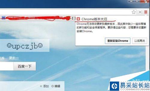 1、如圖所示谷歌瀏覽器右上角自動彈出圖示文字框,點擊重新安裝chrome