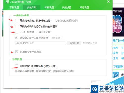 5、找到 安裝升級標簽欄 去掉所有的打鉤,防止360衛士自動升級瀏覽器。
