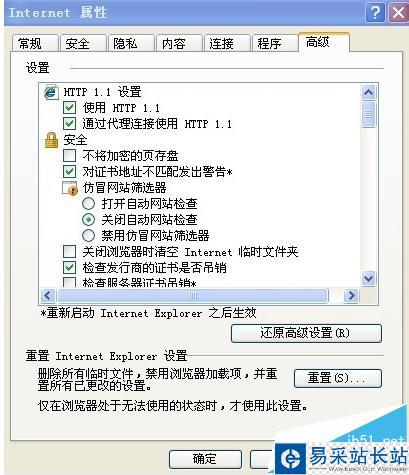 最后的解決辦法是在“控制面板-Internet選項(雙擊打開)-Internet屬性-高級”,點“還原高級設置”選項,以及下面的“重置”按鈕即可。