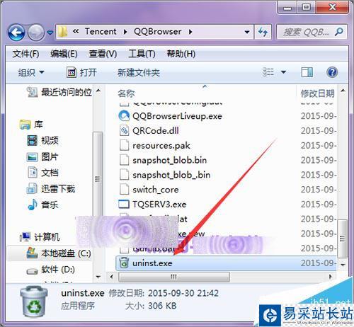 5、打開這個文件夾之后,可以看到這個文件夾中就是瀏覽器的安裝目錄。我們用鼠標點擊最下面找到uninst.exe的這個程序,這個就是這個軟件的卸載程序。如果我們不想使用這個瀏覽器的話,就可以雙擊運行這個卸載程序進行卸載。