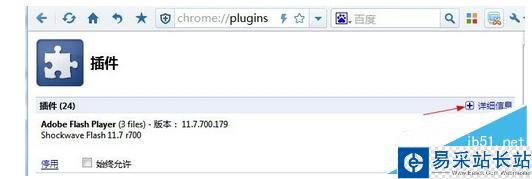 2、安裝完成后重啟瀏覽器,在瀏覽器地址欄輸入chrome://plugins,回車后即可進入插件管理界面。點擊界面右上角的詳細信息,必須點擊展開才能看見Adobe Flash Player(或者Flash)里面的Shockwave Flash選擇小項