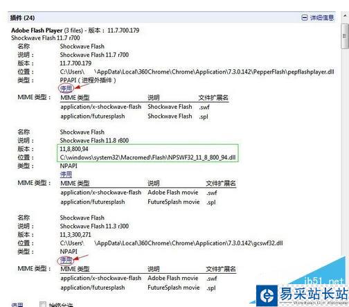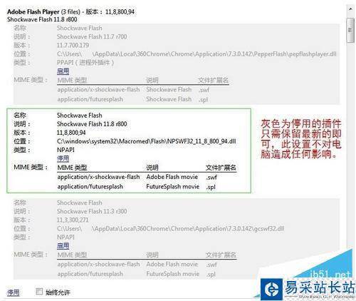 3、找到Adobe Flash Player或者Flash插件項(一般第一個就是),停用所有的Shockwave Flash,只留下剛剛安裝的版本11.8,其他所有東西都不用改動