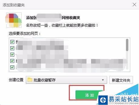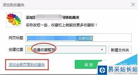 3、這時候習慣上我們會直接點擊“添加”了事,但是仔細觀察我們發現還有個“添加全部頁面到收藏夾”的入口,點擊之。(另外可以新建一個收藏夾)