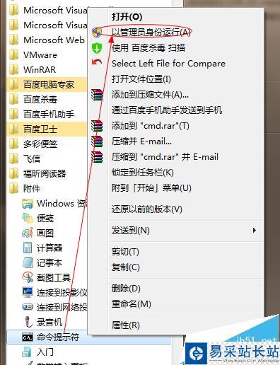 2、找到附件,右鍵“命令提示符”,選擇“以管理員身份運行”。