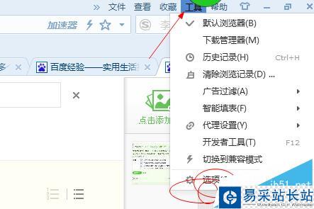 1、打開電腦瀏覽器,鼠標(biāo)點(diǎn)右上方——菜單欄——工具——選項(xiàng)——高級(jí)拉到底部。