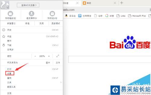 2、首先我們打開UC瀏覽器電腦版,點擊它的左上角圖標在彈出的下拉列表里選擇“設置”