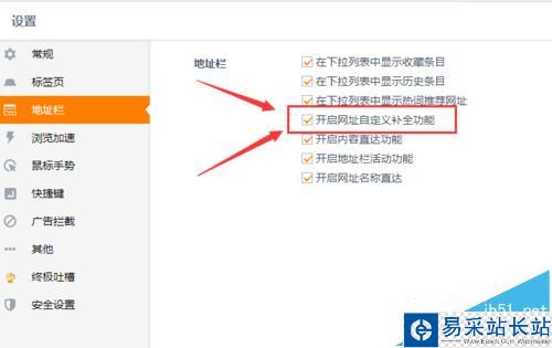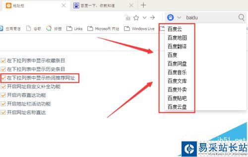 6、在地址欄中我們還可以設置其他的效果,其中“在下拉列表中顯示熱詞推薦網址”指的是地址欄旁邊小搜索框中的下拉搜索量比較高的詞??梢源蟠筇岣呶覀兊霓k公效率。