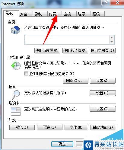 3、進入Internet屬性對話框,點擊上方【內容】選項
