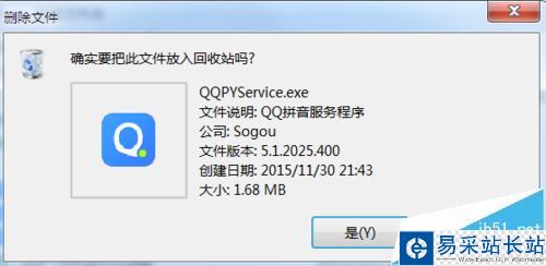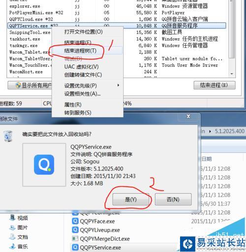 5、等等!先別急著點擊刪除文件對話框中的"是"。回到進程列表中,右擊QQPYService.exe,選擇"結束進程樹",進程結束樹后再點擊刪除文件對話框中的"是"。