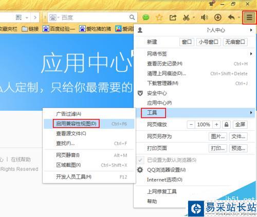 1、先點右上角的“三”的圖案,選擇工具點擊打開“啟用兼容性視圖”;