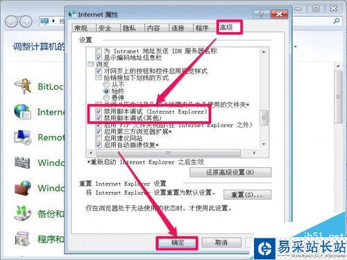 3、在高級選項(xiàng)界面,從“設(shè)置”列表中,找到“禁用調(diào)式腳本(Internet Explorer)”和“禁用調(diào)式腳本(其它)”,將這兩項(xiàng)勾選,確定,