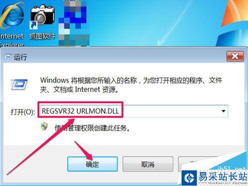 2、在運(yùn)行編輯框中,輸入REGSVR32 URLMON.DLL命令,確定即可,這條命令大小寫都一樣(regsvr32 urlmon.dll)。