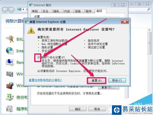 2、在重置“Internet Explorer”窗口,勾選上“刪除個(gè)性化設(shè)置”這一項(xiàng),按“重置”。