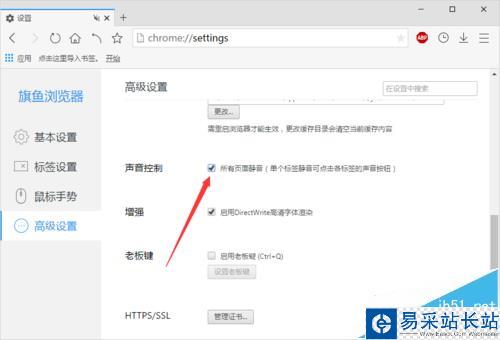 6、在“高級設置”選項卡的右側窗格,找到“聲音控制”下的“所有頁面靜音”選項并將其勾選即可。如圖所示;