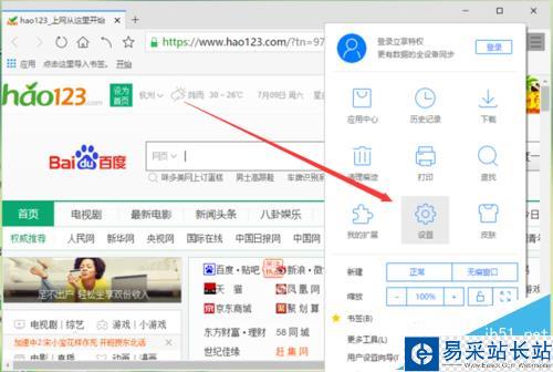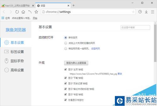 4、點擊“設置”命令選項后,這個時候會彈出瀏覽器“設置”對話框。如圖所示;