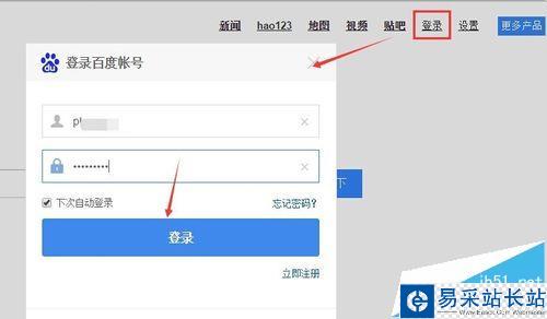 1、打開百度首頁,點擊右上角的登錄按鈕,然后在彈出的百度登錄對話框里輸入百度帳號和密碼,點擊登錄,如下圖所示。