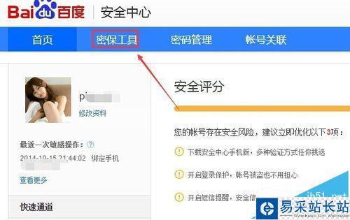 3、點擊后,頁面跳轉到百度安全中心頁面上,我們點擊安全中心首頁導航上的密保工具,如下圖所示。