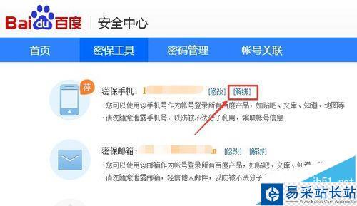 4、在密保工具選項卡下面,我們就可以看到百度帳號綁定的手機號碼了,點擊綁定的密保手機后面的解綁,如下圖所示。