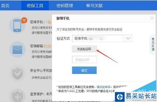 6、點擊后在解綁手機對話框里,我們選擇驗證的方式,這里直接選擇綁定的密保手機就好,然后點擊發送驗證碼。如下圖所示。