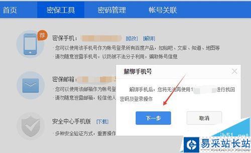 5、點擊解綁后,系統彈出解綁手機號對話框,提示取消綁定后無法用該手機號碼找回密碼及登錄操作,我們點擊下一步,如下圖所示。