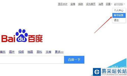 2、登錄成功后,將鼠標移動到百度帳號上,然后點擊下拉菜單里的帳號設置,如下圖所示。