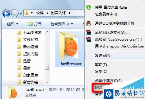 2、找到“juziBrowser”文件夾將其刪除,然后適用電腦管家清理一下注冊表就好了。