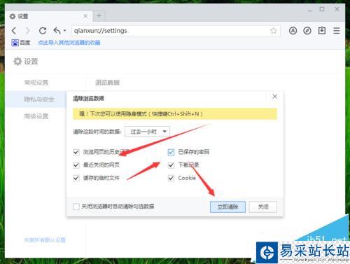 8、在“清除瀏覽數(shù)據(jù)”對(duì)話窗口中,選擇要清除的數(shù)據(jù)選項(xiàng),并點(diǎn)擊“立即清除”按鈕即可。如圖所示;