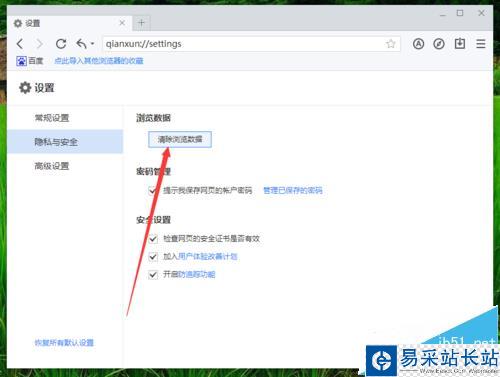 6、在“隱私與安全”選項(xiàng)卡的右側(cè)窗口中,找到“瀏覽數(shù)據(jù)”下的“清除瀏覽數(shù)據(jù)”選項(xiàng)按鈕并點(diǎn)擊它。如圖所示;