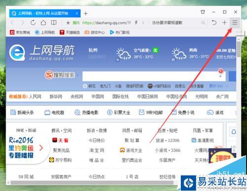 2、在打開的瀏覽器界面,點擊右上角的“三橫”菜單選項。如圖所示;